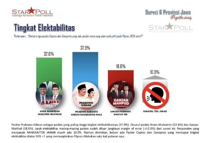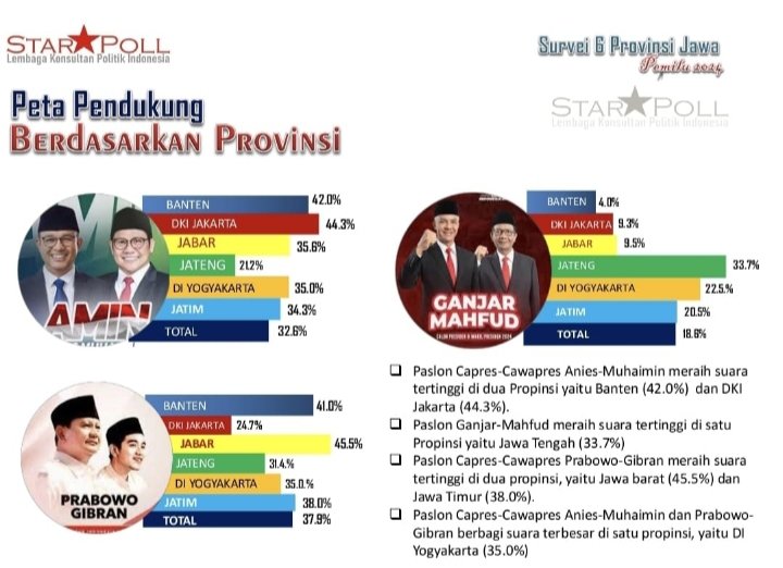 Peneliti Star Poll Selamet Murtianto menyebut pasangan calon Prabowo-Gibran sebagai paslon yang paling tinggi tingkat elektabilitasnya (37.9%) di Pulau Jawa. Disusul paslon Anies-Muhaimin (32.6%) dan Ganjar-Mahfud (18.6%).