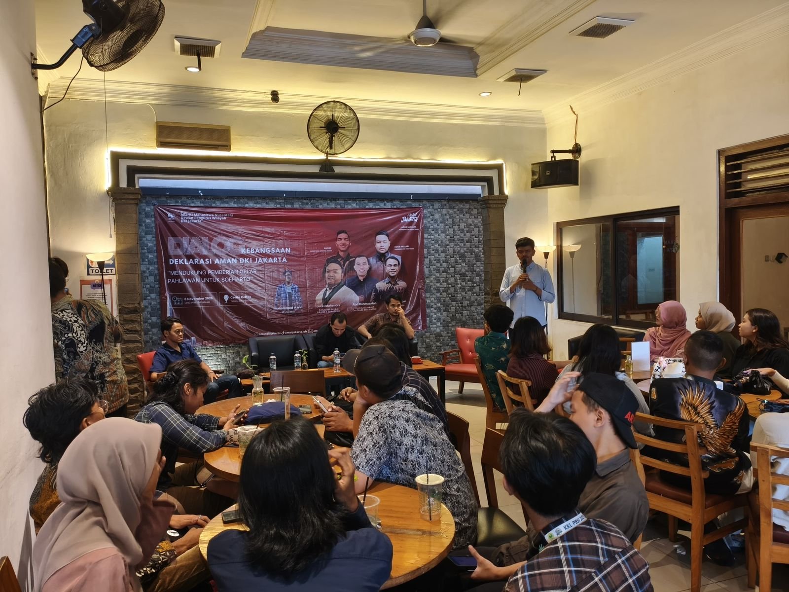 Jakarta, 08-Nov-2025, Aliansi Mahasiswa Nusantara (AMAN) DPW DKI Jakarta mengadakan Forum dialog kebangsaan dan deklarasi yang melibatkan akademisi dan mahasiswa juga dihadiri oleh Agus Muliara selaku ketua umum DPP AMAN ditemani Andre selaku Sekjend DPP AMAN itu membahas kelayakan Presiden ke-2 RI, H. M. Soeharto, untuk dianugerahi gelar Pahlawan Nasional.