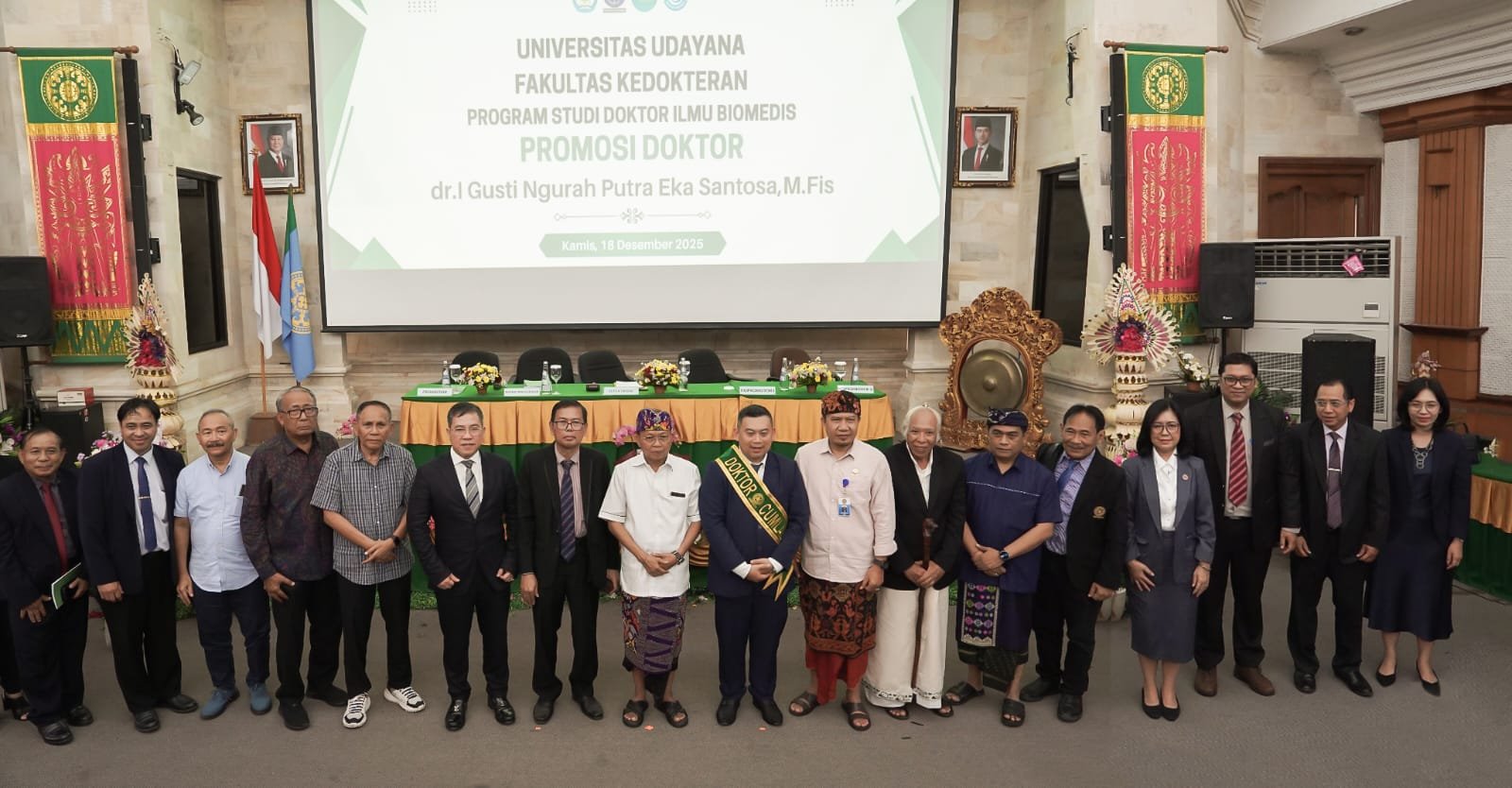 Denpasar, 18 Desember 2025 – Fakultas Kedokteran Universitas Udayana menggelar sidang terbuka disertasi doktoral dr. I Gusti Ngurah Putra Eka Santosa, M.Fis., di Ruang Pertemuan A.A. Made Djelantik, Gedung Fakultas Kedokteran Universitas Udayana. Disertasi tersebut mengangkat judul “Meditasi Siddhā Karya Menurunkan Kadar Malondialdehyde, Memodulasi CD34 Stem Cell Hematopoetik, dan Memperbaiki Kualitas Hidup Pasien dengan Hemodialisa Reguler.”