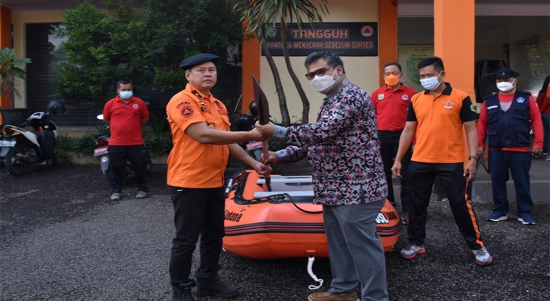 Subang – Kepala Pelaksana Badan Penanggulangan Bencana Daerah (BPBD) Kabupaten Subang, Udin Jazudin menerima bantuan perahu karet dari Sekretaris Perusahaan PT DAHANA